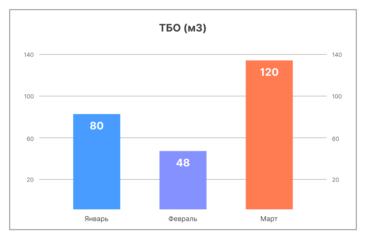 Январь;3706 куб.м.;119 куб.м. Февраль;3435 куб.м.;122 куб.м. Март;3971 куб.м.;128 куб.м.